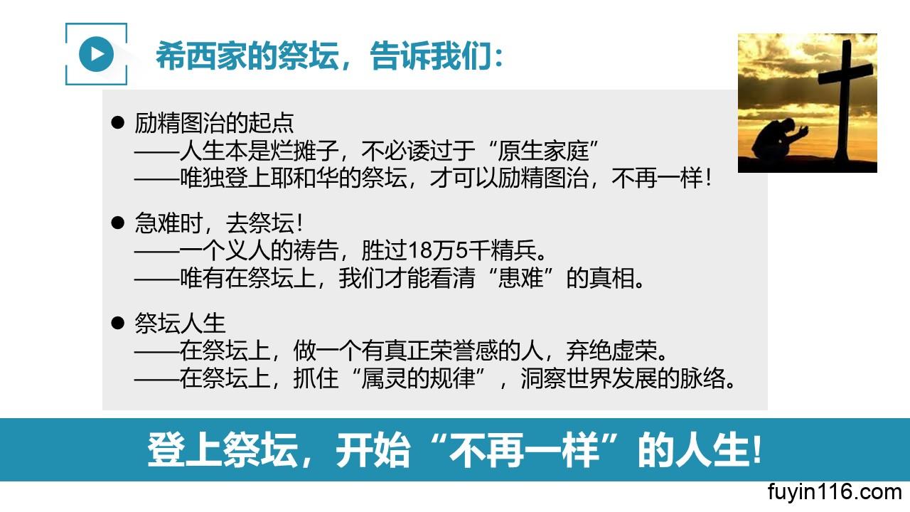 求主让每一个听众,从“希西家的祭坛”中得重要的提醒,知道怎样成为一个在“烂摊子”中不颓丧,反而励精图治,大大得胜的人,一个在你的祭坛上得力量的人。