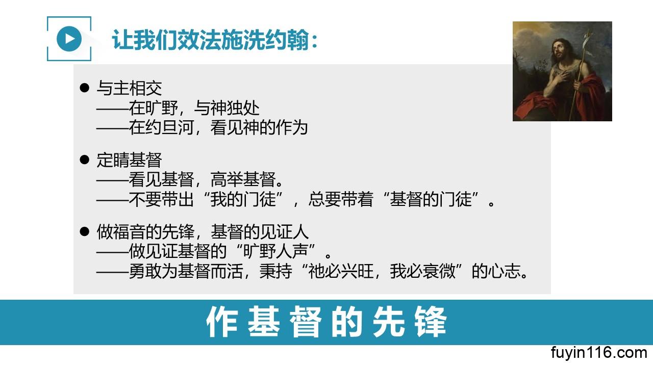 求主让每一个听众,从“施洗约翰的祭坛”中得重要的提醒,知道怎样成为一个“基督的开路先锋”,一个勇敢无畏,得胜世界的人。