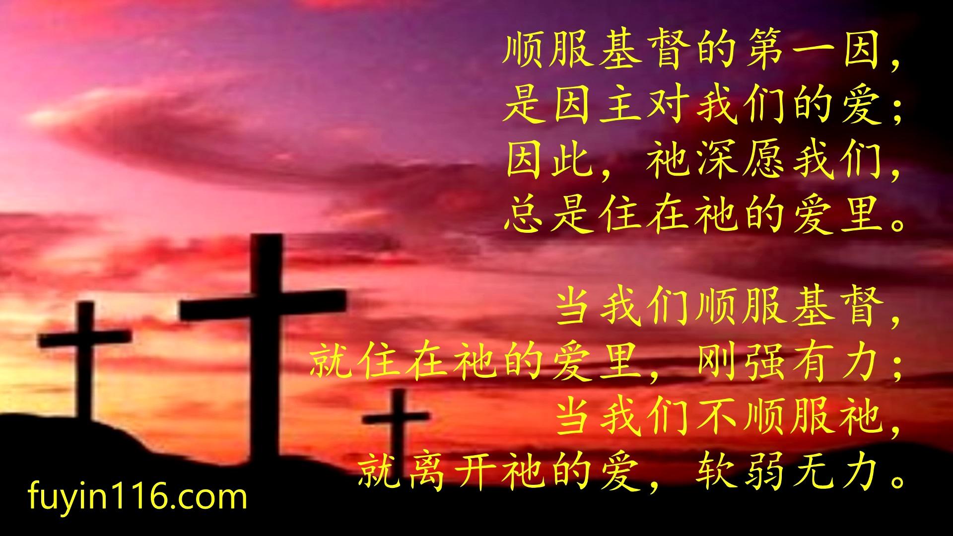 因为唯有“顺服基督”才能让我们住在主的爱里面,让我们刚强有力,谦卑温柔,坚定勇敢。