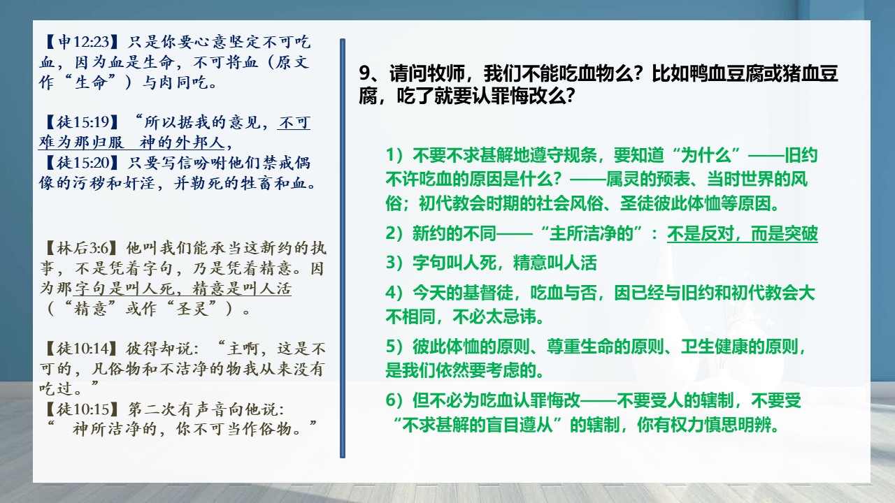 9、请问牧师,我们不能吃血物么?比如鸭血豆腐或猪血豆腐,吃了就要认罪悔改么?