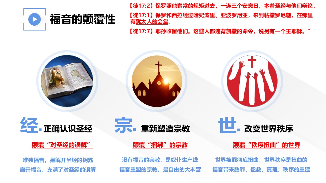 敌挡福音的犹太人,称福音勇士为“搅乱天下的”,他们是出于愤恨,却不经意间点出了福音的特性
