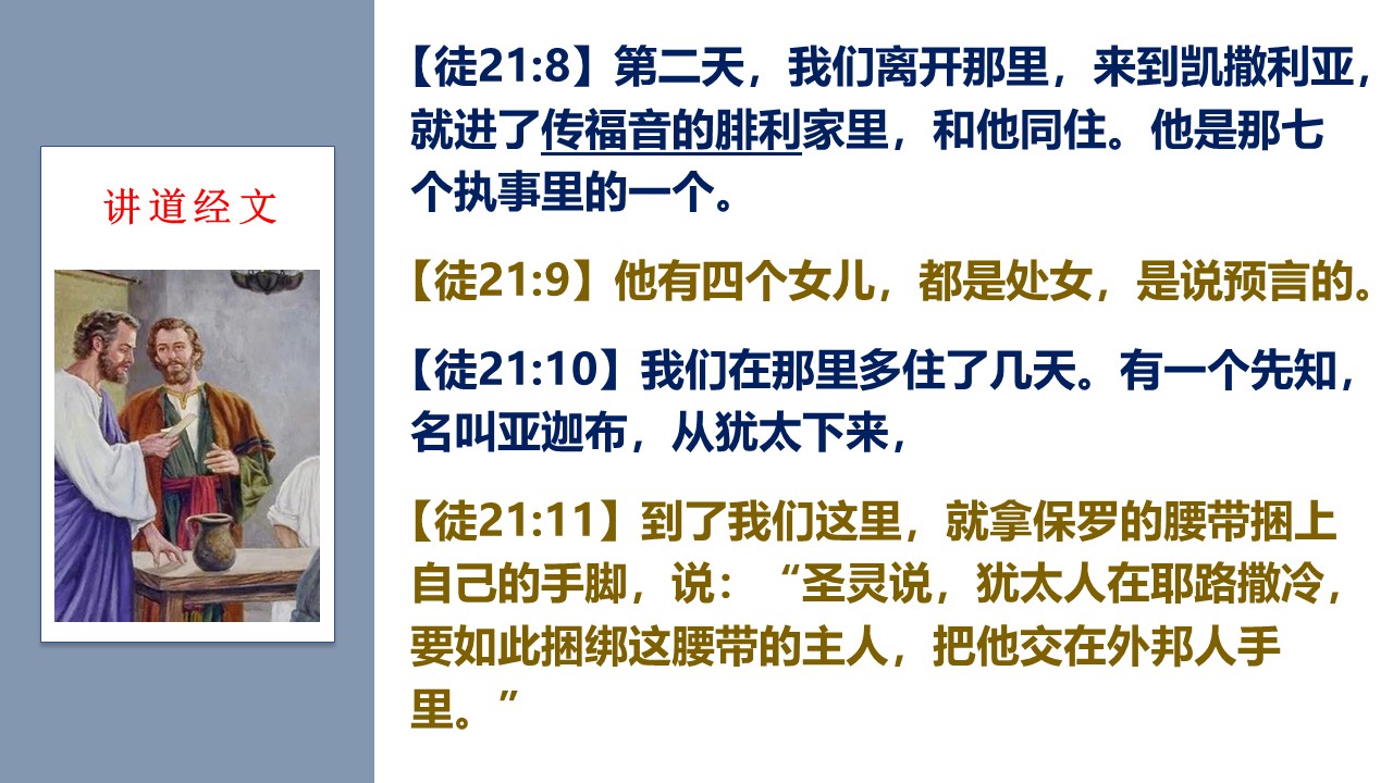 从第8章腓利传福音给埃塞俄比亚太监,到21章,将近20年过去了,我们再次看到他。