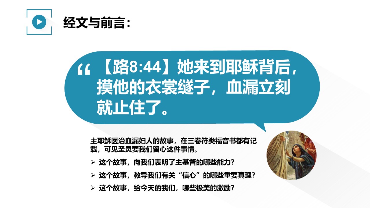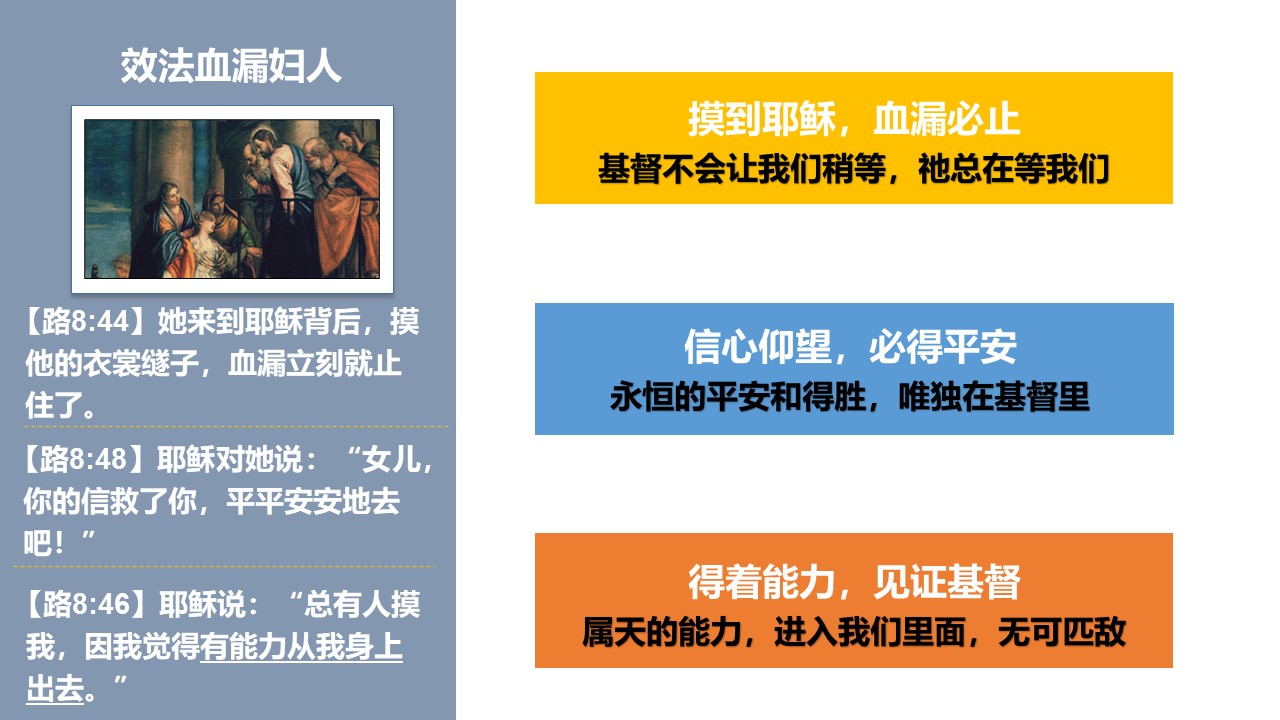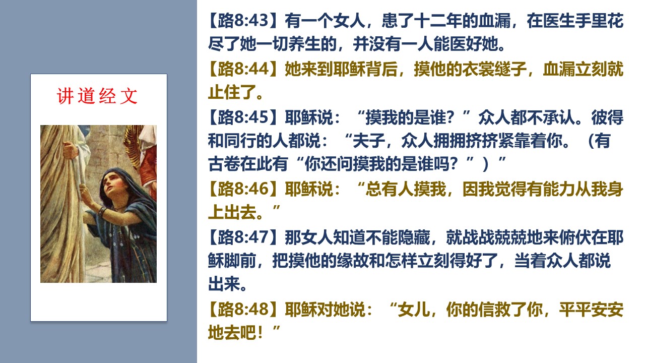主耶稣医治血漏妇人的故事,在三卷符类福音书都有记载,可见圣灵要我们留心这件事情。