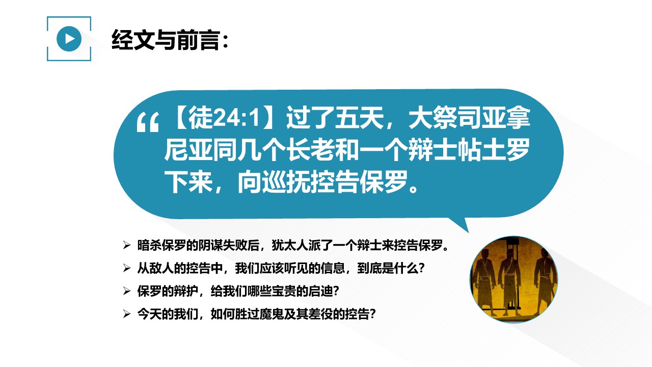 暗杀保罗的阴谋失败后,犹太人派了一个辩士来控告保罗。