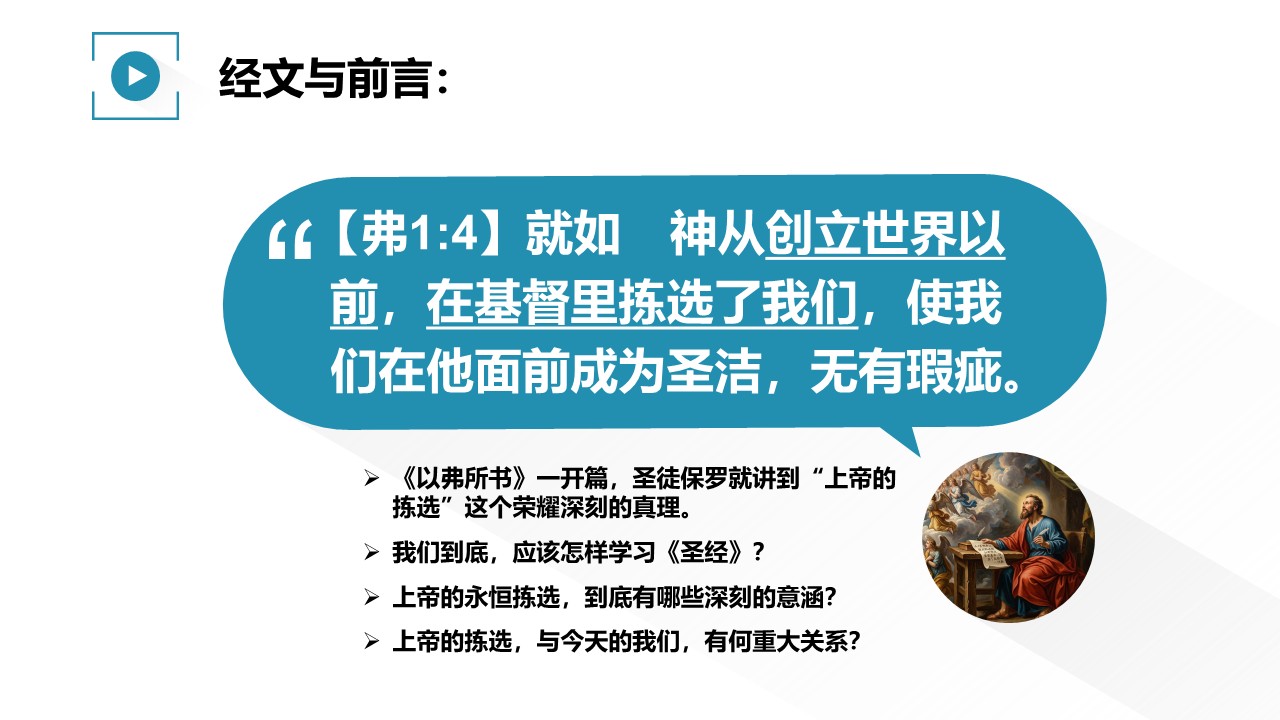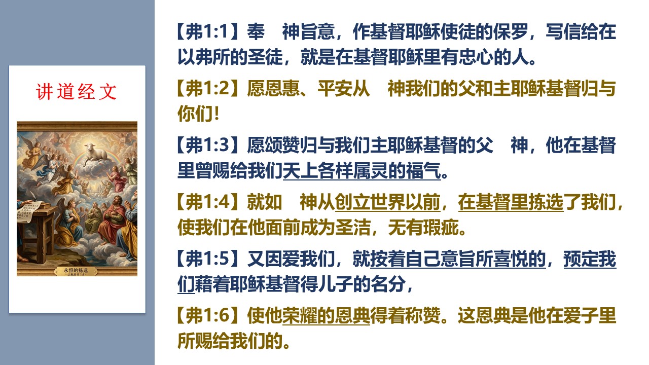 《以弗所书》一开篇,圣徒保罗就讲到“上帝的拣选”这个荣耀深刻的真理。