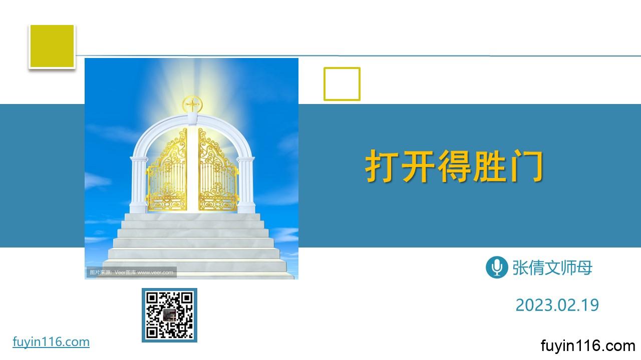 在2月19日,我们有一次特别的主题分享: 《打开得胜门》 “得胜门”是什么意思? 上帝给非拉铁非教会的应许,对我们有何重要的启发? 我们怎样才能打开得胜门? 欢迎您跟着我们的文章的提示,收听我们的录音录像,愿上帝的祝福借着祂的真道,更多地临到每一个认真聆听的灵魂。 您也可以点击下面的链接,重温之前的信息: 《争战得地》系列 点击音频媒体前面的小三角“►”就可以播放 点击下面链接,观看讲道视频(因存储空间有限,zoom视频共享时间为1个月左右) 《打开得胜门》讲道视频 密码: fuyin1…