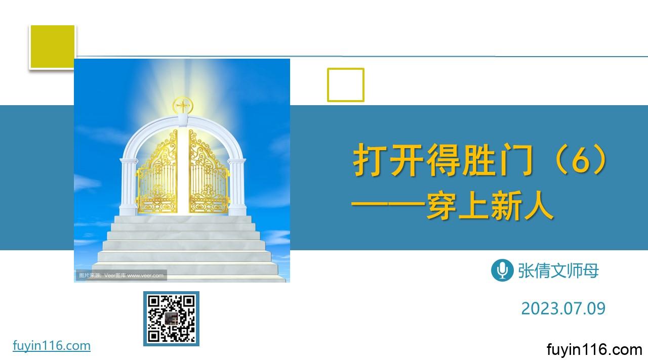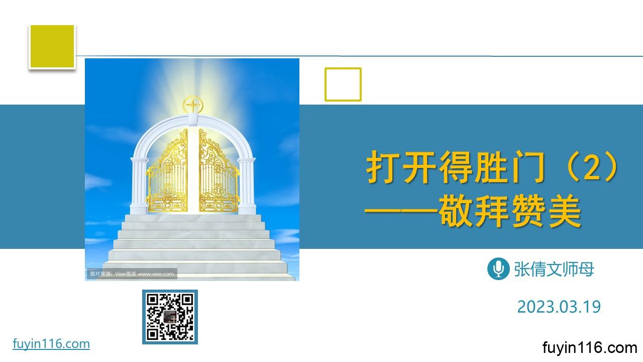 在3月19日,倩文师母为大家分享 : 《打开得胜门(2)敬拜赞美》 打开得胜门,还有哪些重要真理,我们需要注意? 为什么,我们有信心“打开得胜门”? 敬拜赞美与福音的得胜门,有何关系? 愿上帝的祝福借着祂的真道,更多地临到每一个认真聆听的灵魂。 欢迎您跟着我们的文章的提示,参加我们的视频直播或收听我们的录音: 《打开得胜门(2)敬拜赞美》 您也可以点击下面的链接,重温之前的信息: 《打开得胜门(1)》 《争战得地》系列 《新天新地、新圣城》 点击音频媒体前面的…