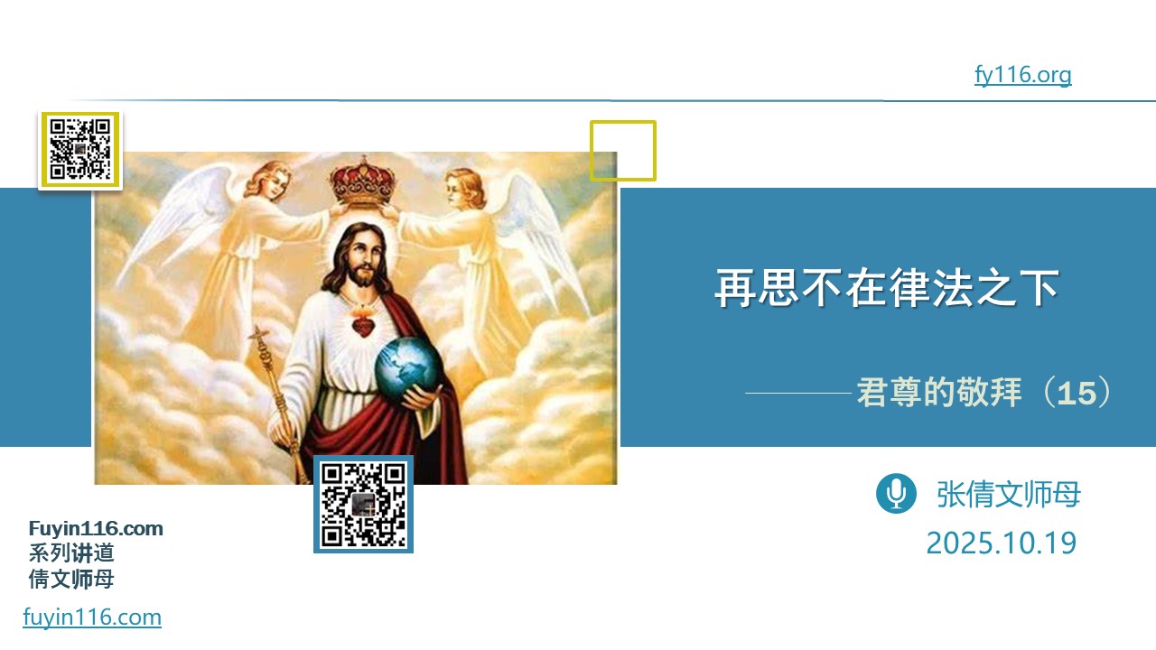 使徒保罗说“你们不在律法之下,乃在恩典之下”。 这节经文,其意涵到底是什么? 上帝赐下律法,其目的到底是什么? 福音与律法的本质区别,到底是什么?   愿上帝的祝福借着祂的真道,更多地临到每一个认真聆听的灵魂。 欢迎您收听: 《再思不在律法之下》 本文链接(若有朋友在微信里打不开本文,可以把下面的链接发给他,在浏览器里打开): https://lms116.me/fx2f 您也可以点击下面的链接,重温之前的信息: 《君尊的敬拜系列》 ⚠️⚠️⚠️ 注意 ⚠️⚠️⚠️ 鼓励大家在手机浏览器或电脑浏览器…