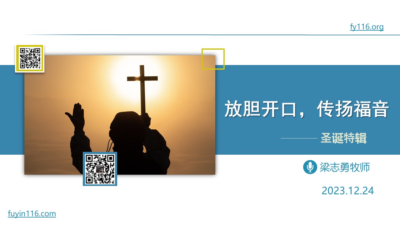 12月24日的主日,正好也是平安夜,我们有一次“圣诞特辑”的专题分享。 我们怎样才能放胆开口,传扬福音? 我们应该怎样放胆开口,向谁开口? 我们应该怎样放胆传扬福音?   愿上帝的祝福借着祂的真道,更多地临到每一个认真聆听的灵魂。 欢迎您收听: 《放胆开口,传扬福音》 https://lms116.me/tfjo   点击音频媒体前面的小三角“►”就可以播放:   墙外观看: 我们的阿爸天父,感谢赞美你 感谢你赐给我们《圣经》真理,让我们可以领受你恩典和真理的祝福。 我们特别感谢…
